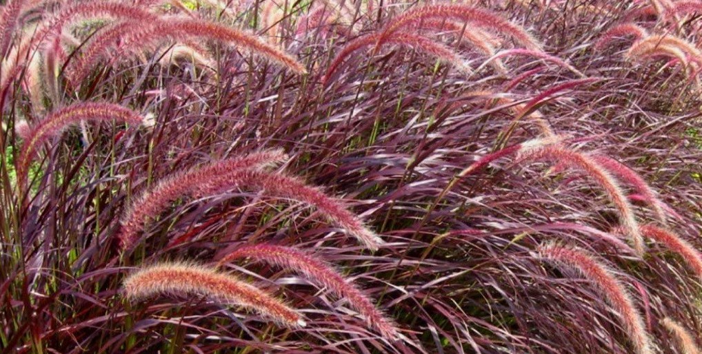 ▲ Purple Fountain Grass (Pennisetum setaceum ‘Rubrum’). A tidy, dense clump of purplish maroon blades topped with rose-red plumes.